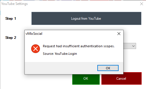 "Request had insufficient authentication scopes" error when trying to login to YouTube